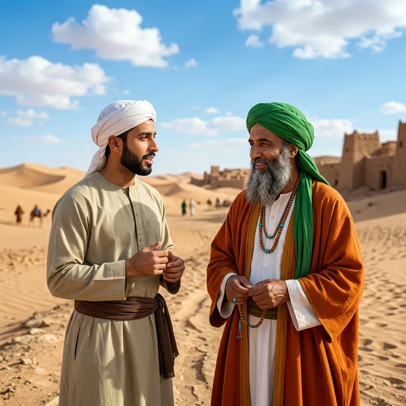 Image Prompt: A 4K ultra-realistic, bright HD scene in TikTok size (1080x1920 pixels, vertical), set in a 7th-century desert environment. In the foreground, a 30-year-old Arab man with a short, neatly trimmed beard stands wearing a light khaki traditional long thobe, cinched at the waist with a deep brown cloth belt, and a white turban on his head. He faces a wise 50-year-old Arab Sufi with a long, flowing black beard, wearing a vibrant green turban, a rich orange robe, and a simple beaded necklace. The Sufi stands with a calm, knowing expression, while the man looks curious, mid-question. They stand on sandy ground with a clear blue sky dotted with fluffy white clouds in the background, casting soft shadows. The lighting is warm and natural, evoking a serene 7th-century desert atmosphere.