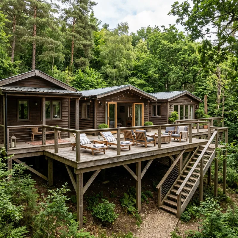 Render a realistic-style image of three cabins connected by a deck. This deck serves as an expansion area of the cabins and is furnished with chairs and sun loungers for outdoor relaxation. The surrounding environment is rich with nature and trees. Both the cabins and the deck are elevated about 2 meters from the ground.