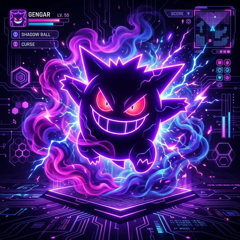 Imagine Gengar in the center of the image with a dark background and purple neon effects illuminating its silhouette. Around it, mystical smoke swirls and electric sparks appear, all with a futuristic style and vibrant colors. The background may include circuit patterns or details reminiscent of a video game interface to reinforce the gaming style.