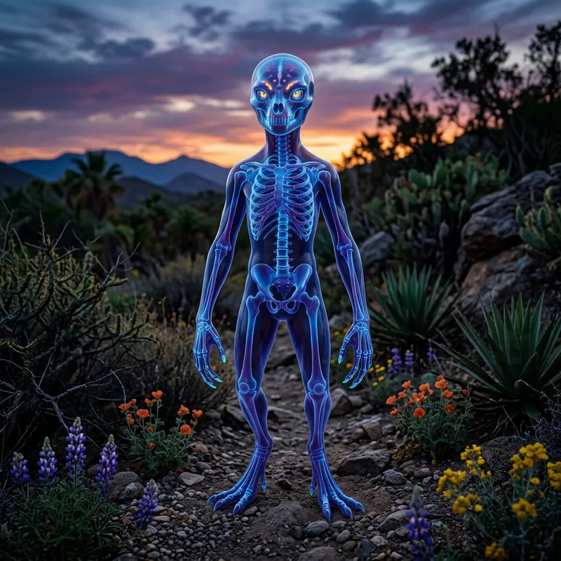 A concept of a fictional creature named Hueso Kawia, with a skeletal structure visible through transparent skin, glowing eyes that radiate with life and intelligence, standing upright with agile digits on its hands and feet. Imagine it in a shades of luminescent blue and deep purple, in a semi-arid tropical setting at dusk, with a few robust desert flowers dotting the landscape.