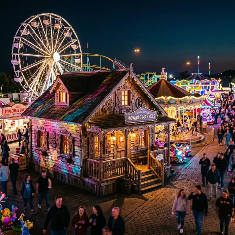 A single-story wooden house with movable features set in a nighttime amusement park, illuminated by vibrant lights from nearby attractions. Enjoyable music and laughter can be faintly heard in the background. Its intricate architectural details, the shadows created by its structure under the dynamic lights, and the playful aura of the park around it create a harmonious photograph.