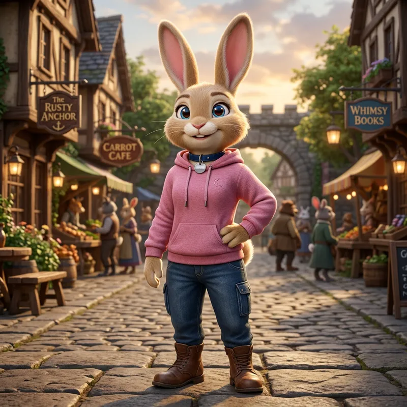 Design a humanoid character with distinct features: this character takes the form of a tan-fur, blue-eyed bunny, hinting at a warm friendly persona through its welcoming smile. Its posture is decidedly relaxed, as one hand purposefully rests on its hip. Adding a touch of style is a pink hoodie adorned over its body and a collar. Target an art style that merges the realms of imagination with reality. Pay particular attention to detail, with specific emphasis on the reflective sheen in the fur, the interplay of light and shadow, and the highly expressive aspects of the character's face.