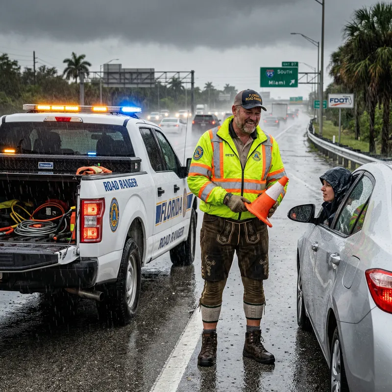 Florida Road Ranger in Lederhosen: Unique Rainy Scene