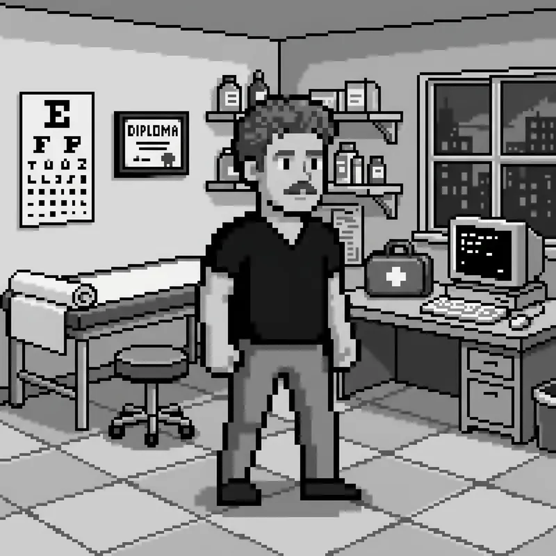 Visualize a male, 8-bit retro-style video game character of Caucasian descent, standing in a lively, pixelated doctor's office. He has a mustache and is dressed in a black v-neck t-shirt. His hair, a collection of brown pixels, is short and curly. The environment recreates the feel of a classic sandbox video game with its pixelated, block-style features, displayed in a black and white color scheme. Our character, typical of classic 8-bit games, is medium-sized, humanoid, characterized by muted, flat colors and distinct, blocky shapes. He is seen in a neutral stance, poised for potential animation.