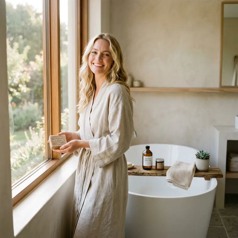 Envision a moment of tranquility with a blonde individual in a serene bathroom, who is gracefully holding a bar of soap next to the window. The soft, low sunlight filters through the glass and illuminates the neutral tones of the minimalist surroundings. On the bathtub, a simple shelf displays a curated selection of items. The individual, radiating joy and contentment, offers a beautiful smile. The scene is captured in a simple yet powerful portrait shot using a fixed focal length lens, resulting in an image rich in photographic texture. The picture is in 8k HD, in portrait orientation with a 1:1 aspect ratio, producing a breathtaking image.