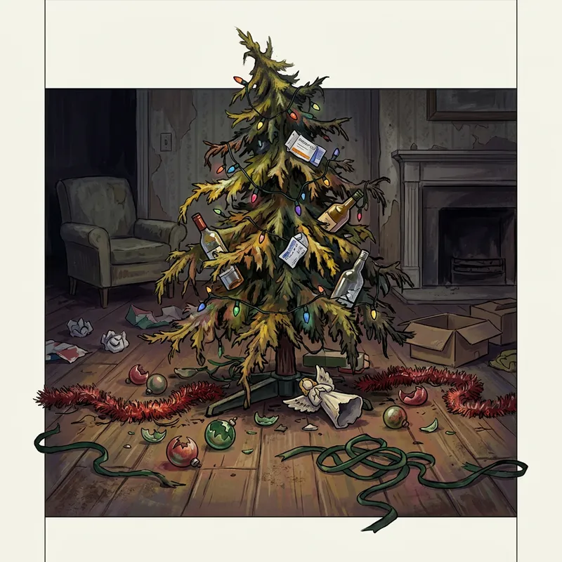 A cautionary illustration portraying the destructive impact of addiction during Christmas. In the center, a hapless Christmas tree is distorted and discolored, symbolizing the disastrous effects of alcohol and drugs. Surrounding it, Christmas decorations lay neglected and fragmented. Shattered glass baubles and tattered ribbons scatter themselves aimlessly across a run-down living room. However, the picture maintains a clean structure with ample empty space at the top and bottom for textual incorporation.