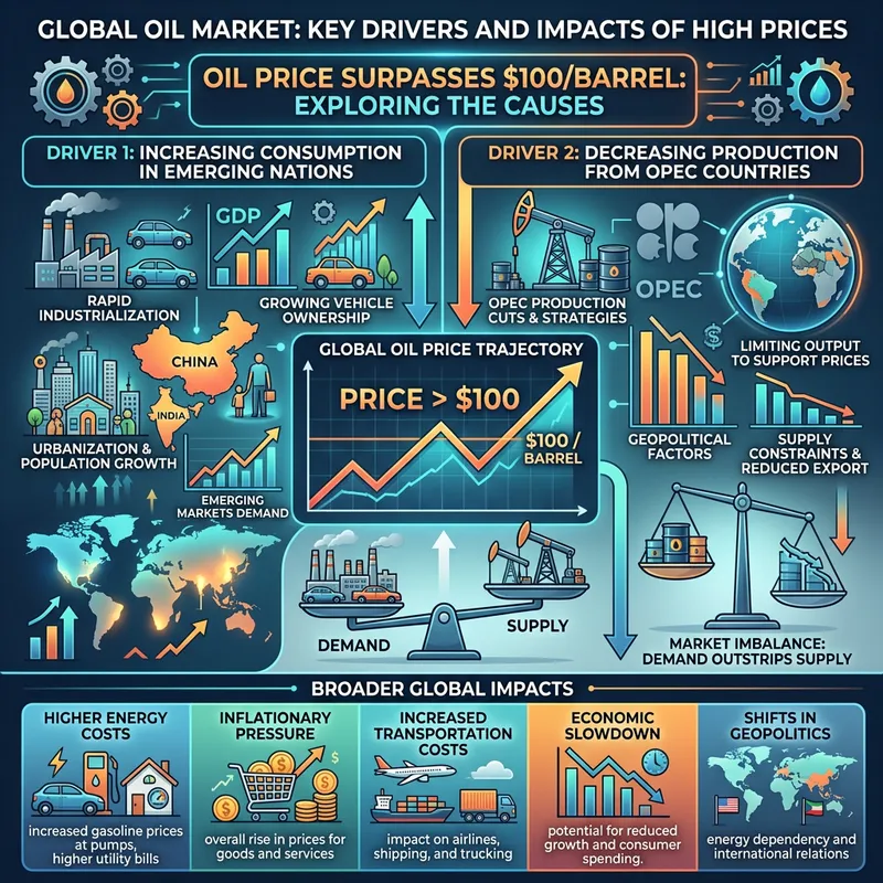 The price of oil has surpassed the 100 dollars per barrel mark. This is primarily due to two reasons. On one hand, there's an increase in consumption by 'emerging' nations and on the other, there's a decrease in production from major producing countries represented in OPEC. Depict how these events have impacted the oil market, visualized in a detailed graph.