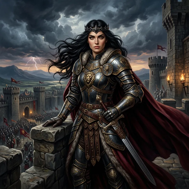 Render a powerful depiction of an imposing warrior princess in a fantasy world. Characterise her with mesmerizing brown eyes, and long, flowing black hair that effortlessly captures the wind. Aim for a style reminiscent of a romantic, Victorian era painting with excessive drama through sharp contrasts and lighting, appeals traditionally used in fantasy genre. Incorporate a sense of command and confidence in her pose, suggesting her unquestionable authority. Capture these intricate details with the sharpness and clarity of a high resolution photography.