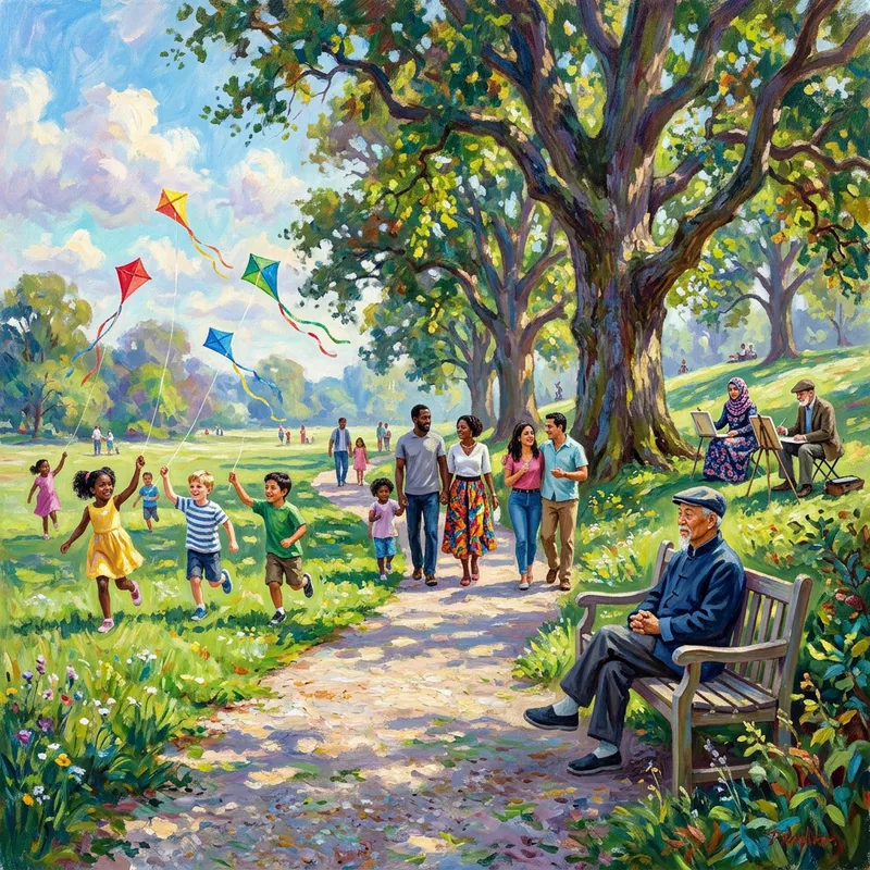 Generate an artwork in the style of Impressionism, which was popular in the late 19th and early 20th centuries. The scene is of a peaceful day in a park filled with old oak trees along a walkway. There are people from different descents such as Black, Hispanic, and Caucasian enjoying a sunny afternoon. An elderly Asian man is resting on a park bench while children with diverse backgrounds are flying kites. In the distance, a Middle-Eastern woman and a White man are painting the landscape using watercolors. Keep the characteristics of impressionism intact with loose brushwork, and open composition.