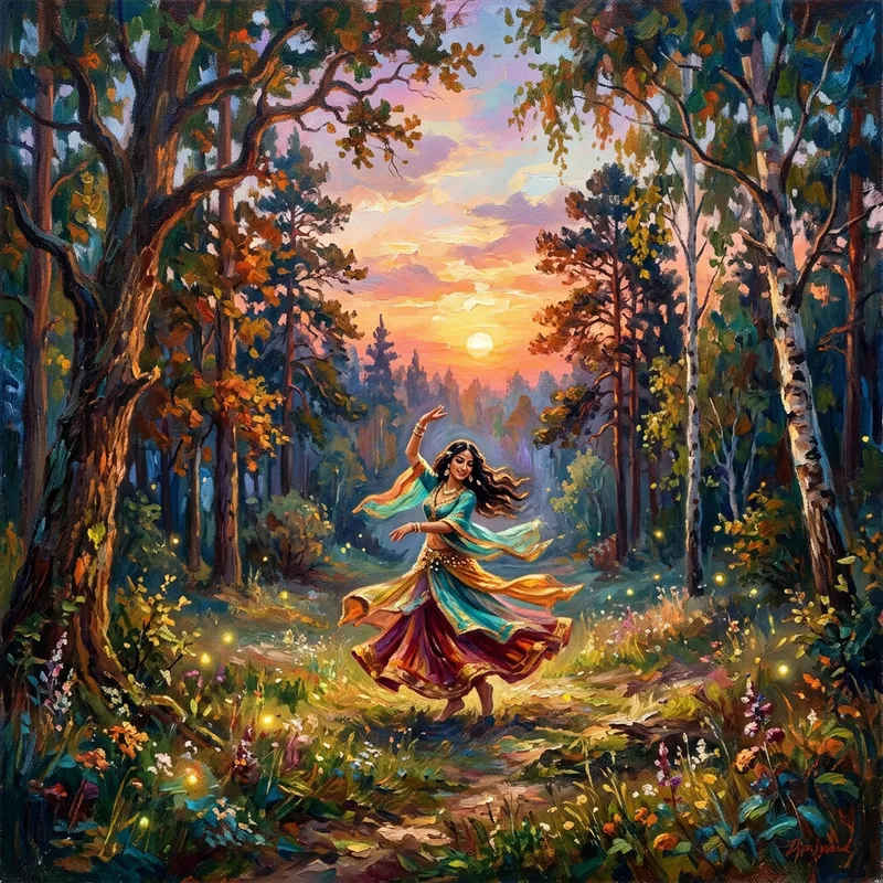 Impressionist Mystical Forest Sunset with Dancing Woman