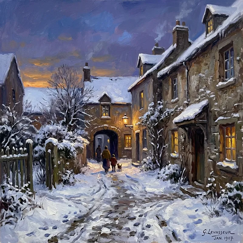 Impressionist Oil Painting: Winter Twilight Behind Houses