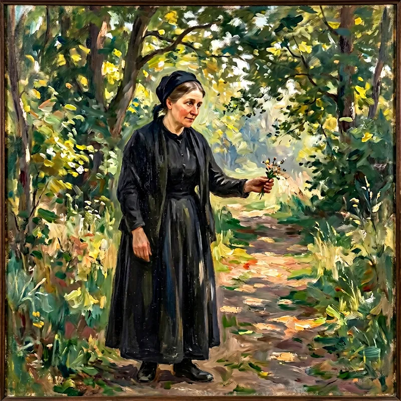 Impressionist-style Painting of a Middle-Aged Widow Offering in Outdoor Setting