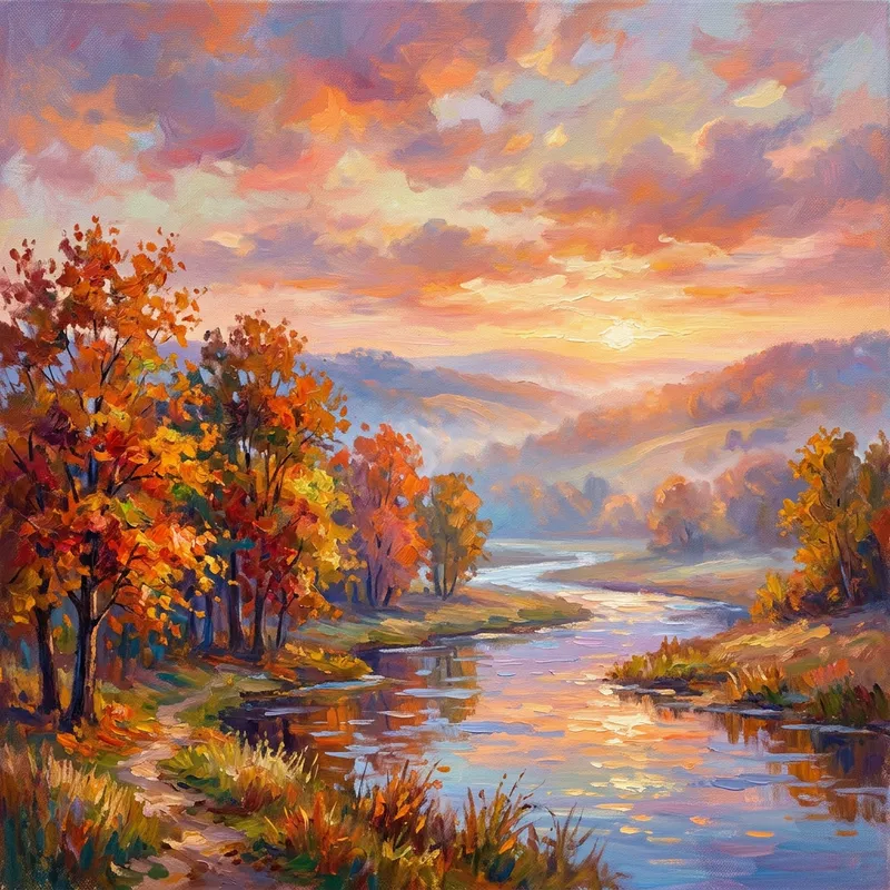 An impressionist style landscape painting featuring softly blurred lines and diffused light. The scene unfolds with a vibrant row of trees on the foreground, their leaves displaying a vivid palette of autumn colors. A gently winding river, reflecting the colors of the sky, cuts through the middle of the scene. In the distance, gentle, rolling hills recede into misty perspective. Above, the sky is a mixture of oranges, pinks, and purples suggesting a sunset. The painting captures the fleeting essence of the moment, characteristic of Impressionism.