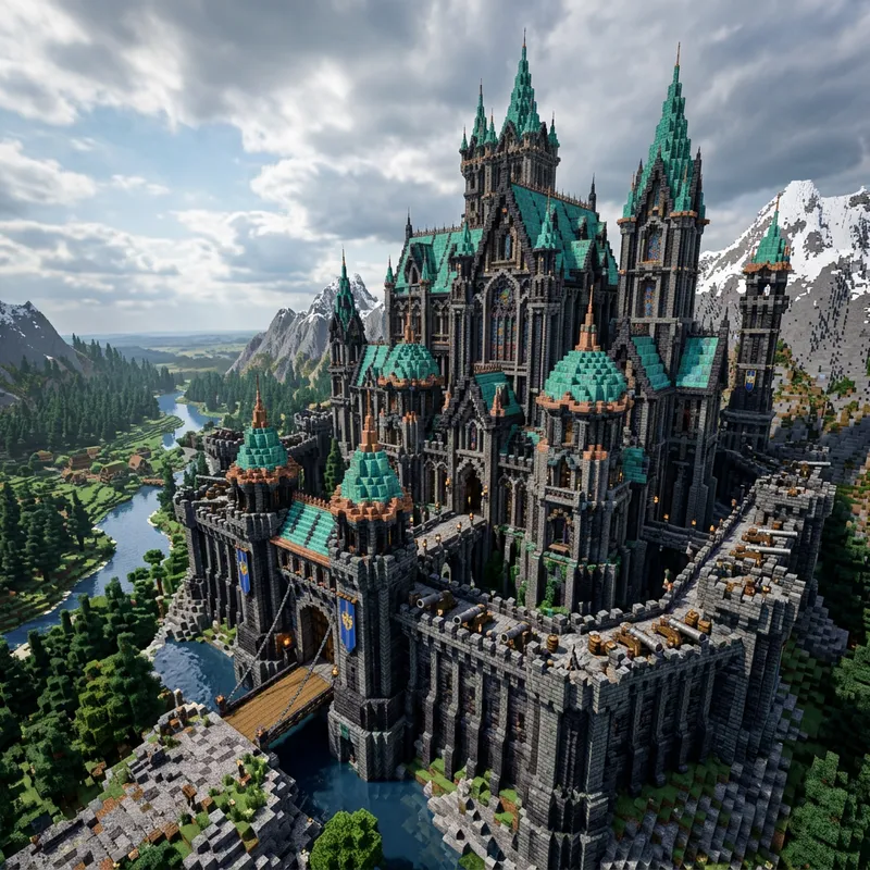 A very large, modern interpretation of a medieval gothic castle with oxidized copper roofs. Defense mechanisms include cannons. The castle is built in Minecraft with high definition details.