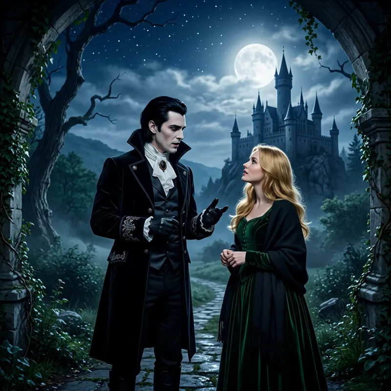 In an enchanting landscape under the pale moonlight, an aristocratic figure with jet-black hair engages in a dramatic dialogue with a captivated Caucasian woman with golden blonde hair. This individual's fascinating attire and presence suggest a vampire theme. In the distance, a silhouette of a Gothic castle stands quietly, its towers reaching towards the sky, bathed in the ethereal glow of the moon. This scene, a mix of eeriness and tranquility, is accentuated by the mesmerizing environment of the night.