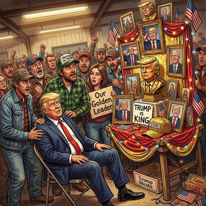 In a hyper-realistic, satirical style reminiscent of contemporary political cartoonists, depict a scene featuring Donald Trump leaning back, visibly uncomfortable, amidst a group of rugged, rural supporters dressed in denim and flannel, their expressions a mix of adoration and fervor. The composition should capture Trump in the foreground, with a slightly tilted camera angle that emphasizes his unease as he gazes at an elaborate shrine adorned with kitschy memorabilia - a gilded statue of himself, framed photographs, and bizarre tributes - situated prominently at the center of the scene. The lighting is dramatic and focused, casting stark shadows that enhance the tension of the moment, with a warm, slightly over-saturated color palette dominated by earthy tones and flashes of gold to evoke a sense of both reverence and absurdity. The atmosphere is charged with an awkward cult-like devotion, inviting viewers to explore the juxtaposition of celebrity and commonality, akin to the works of artists like Keith Haring or Andy Warhol, utilizing bold outlines and exaggerated features to amplify the comedic yet critical undertone.