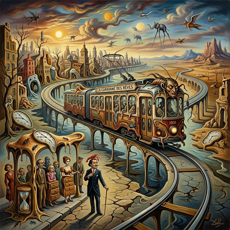 In a surrealist visual style reminiscent of Salvador Dalí, create a public transport (bus, tram, train) in the city.