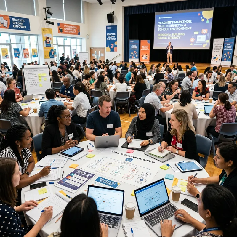 Illustrate the energetic atmosphere of an extensive Teacher's Marathon on information security, centered around the theme of 'Safe Internet in a School Environment'. Picture an assembly hall with teachers of various descents and genders actively engaged in discussions, brainstorming sessions, and interactive presentations. Imagine them using a variety of informational materials, such as charts, diagrams, and digital tools, to delve deeply into the topic. The room is filled with the spirit of collaborative learning and collective effort to enhance internet safety in schools.