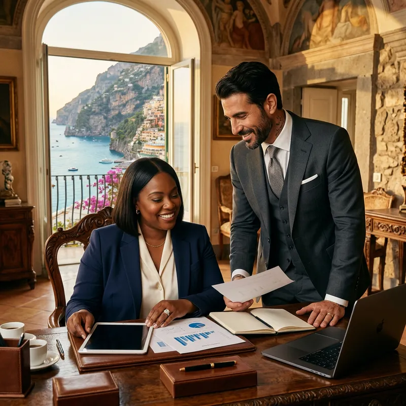 In view is an image capturing the elegance and confidence of a plus-size African American woman with straight hair, who is sitting at an ornate desk in a luxurious Italian villa, the stunning vistas of the picturesque Amalfi Coast spreading behind her. The scene has a warm golden glow, evoking the feel of Renaissance-era paintings. She sports a large diamond wedding ring, with her impeccable business attire further enhancing her image of professionalism and charisma. Standing beside her is an olive-skinned Italian man, his handsome features glowing under the sunlight. His well-tailored suit celebrates his strong physique and his well-kept beard exudes masculine charm. Intricate tattoos are faintly visible beneath his shirt collar, hinting at a vibrant and creative side. A matching diamond wedding band adorns his hand. Viewers experience a great sense of dedication and camaraderie between the couple as they are engrossed in their business venture. The high-resolution image quality yields a vivid immersion into their opulent environment and the scenic beauty of the Amalfi Coast.