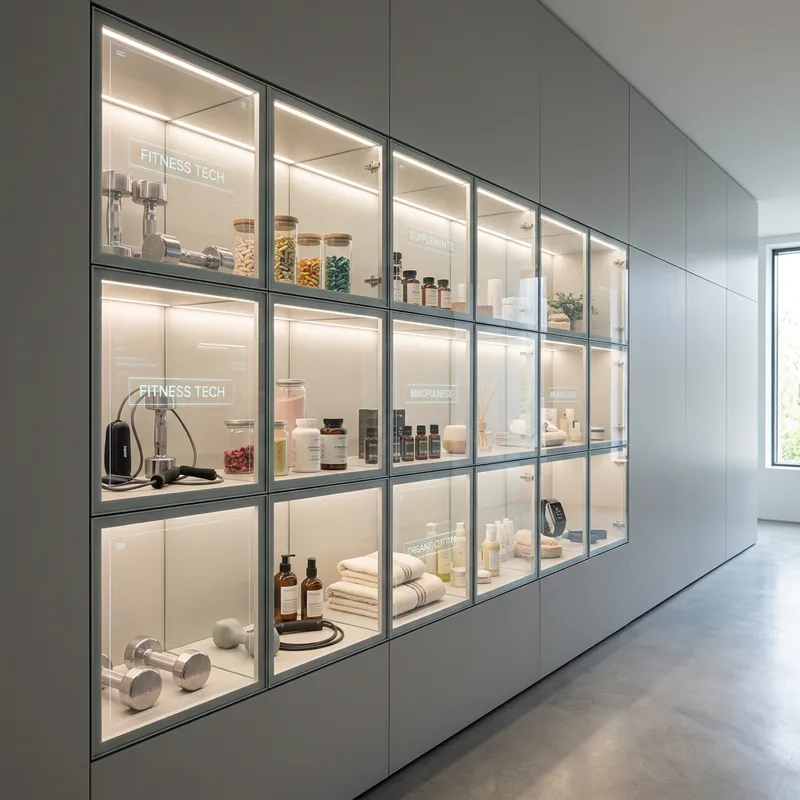 An advanced digital showcase embedded in a wall, composed of multiple small, attached glass rooms. Each compartment contains different products geared towards health and wellness. These can range from fitness equipment to dietary supplements, beautifully arranged for display. Soft, flattering lighting illuminates each glass enclosure, emphasizing the products inside and creating a sleek and modern atmosphere. The wall itself has a smooth, neutral design, complementing and enhancing the overall aesthetic of the showcase. The in-wall design concept provides a seamless integration into the surrounding environment, making it an ideal structure for modern interior architecture.