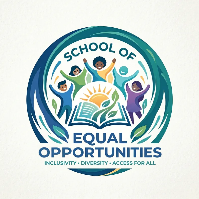 Design a creative logo for a school named 'School of Equal Opportunities'. The logo should ideally represent the ethos of the school which is inclusivity, diversity, and equal access to education for all. Use cool yet inviting colors to give it a friendly and welcoming vibe.