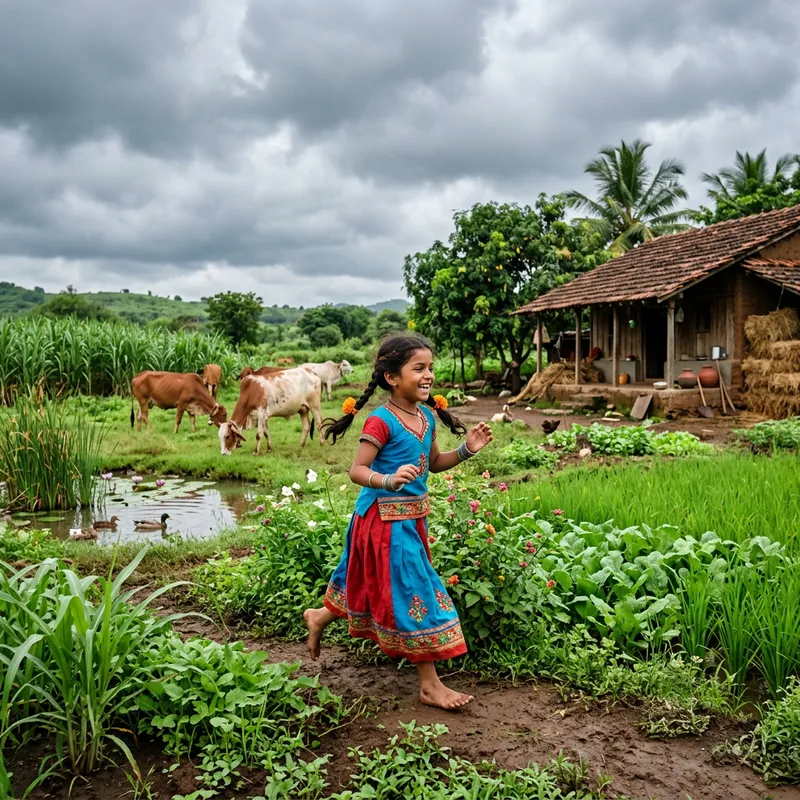 A young Indian girl joyfully engages in play on a farm. She's dressed in traditional Indian attire, running around, with the farm animals and lush vegetation serving as the perfect backdrop. There are cows grazing and a small pond in sight. The sky above is filled with clouds, signalling the start of a potential rain shower. There's a rustic wooden farmhouse to one side, contributing to the idyllic rural scenery. The girl appears content. The land seems rich and fertile, hinting at the rich variety of crops grown on this traditional Indian farm.
