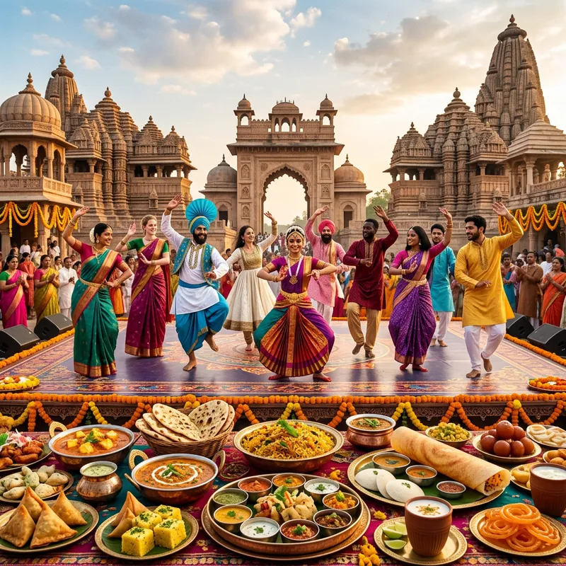 A breathtaking scene illustrating the extensive and vibrant culture of India. The image showcases region-specific traditional dances performed by a diverse group of dancers. Men and women of various descents, including Caucasian, Hispanic, Black, Middle-Eastern, and South Asian, are all elegantly dressed in traditional Indian attire, performing steps unique to Indian dance forms. The backdrop majorly displays Indian architecture, featuring majestic temples and historical monuments that demonstrate a blend of splendidly intricate design details and symmetry. Towards the front of the image, we see a lavish spread of delicious Indian food, robust with colors and textures depicting the diverse range of Indian cuisine. The table set includes various dishes from different regions of India, each with its distinct aroma and taste.
