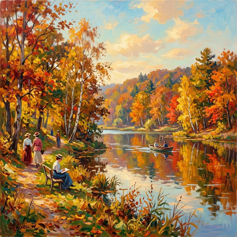 An autumnal scene vibrating with the colours of Indian Summer. Picture this with lush, vibrant hues and bold, expressive brush strokes, evocative of the style found in Impressionist-era paintings created with oil on canvas. Imagine a serene atmosphere where perhaps there are people enjoying the warm weather and beautiful colours, or perhaps there’s a calm lake reflecting the breathtaking scenery. The balance between tranquillity and vivaciousness is key, just like the creations of artists active before 1912.