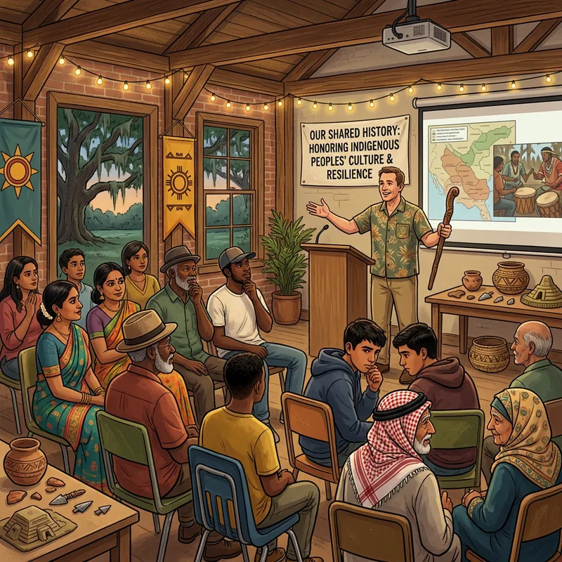Craft an illustration portraying a seminar taking place in a community setting in Louisiana. The scene entails an enthusiastic presenter, a Caucasian male, engaging with an assorted audience consisting of individuals of diverse descents - South Asian women, Black men, Hispanic teenagers, and Middle-Eastern elderly - about indigenous peoples' rich history and unique culture, as well as the hardships they endure. The atmosphere is filled with understanding and empathy as they interact and share thoughts. Intricate details in the form of historical artifacts, traditional symbols, and documentary screenings should be scattered around the scene to enrich the educational experience.