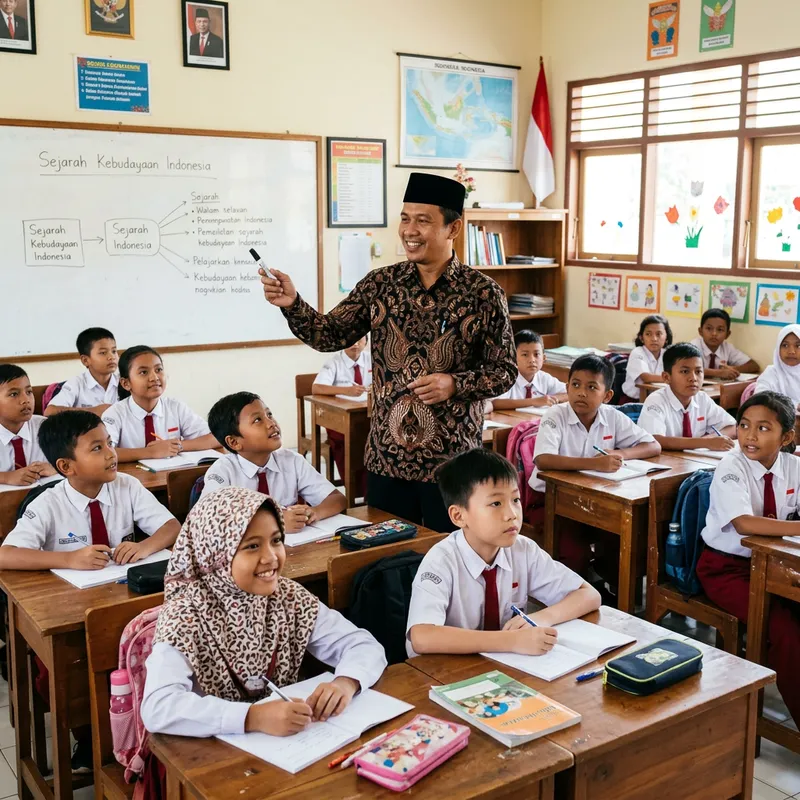 An Indonesian male teacher in traditional attire, wearing a black peci (songkok), is teaching in a classroom. His eager students, a mix of boys and girls from diverse ethnic backgrounds, are attentively listening to him.