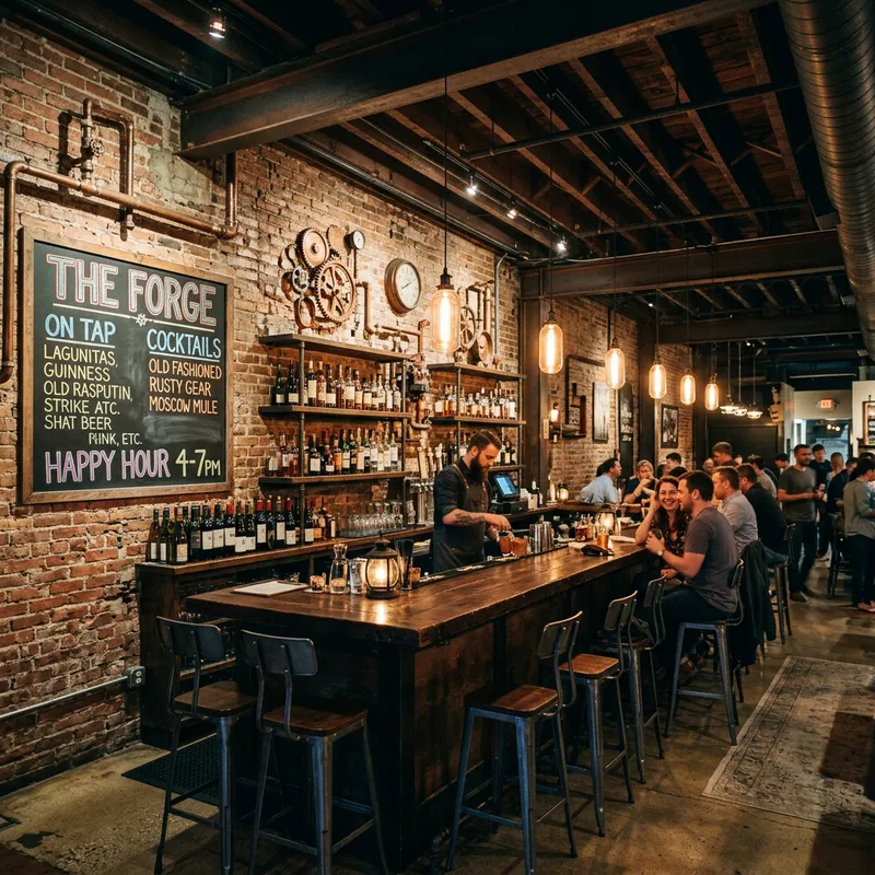 Imagine an industrial-style bar. The walls are covered in rustic brick and the exposed metal beams across the ceiling add to the rugged charm. Low-hanging pendant lights with large, old-fashioned light bulbs cast a warm, inviting glow. Wine and liquor bottles line the shelves behind the wooden counter, where matching bar stools are neatly arranged. Vintage elements, like antique copper gears and pipes, are used as decorative pieces, emphasizing the industrial aesthetic. A chalkboard menu against one wall displays the bar's diverse offerings in bright, bold handwriting.