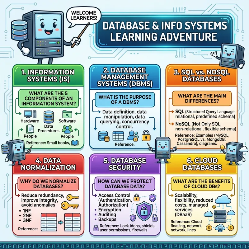 An educational image showing a variety of questions and answers about key concepts in information systems and databases. The picture is divided into different sections, each containing a quiz question, approaches to the answer, and reference materials. Topics might include data integrity, security, normalization, cloud systems, and database architecture. Adding an aesthetic touch, the questions are encased within colorful boxes, and there's a playful mascot, which is a smiling cartoon version of a computer server hosting a database, guiding learners through the game.