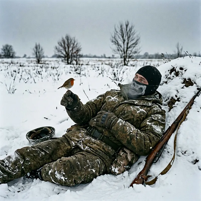 An injured soldier, half-lying in a snow-covered field during winter, is slowly dying. His mask features a chilling skull design. Despite the grim situation, a tiny bird is perched upon one of his fingers, bringing a tiny glimmer of life amidst the somber scene.
