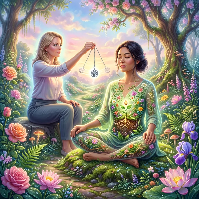 A surreal scene showcasing the concept of inner growth aided by hypnotherapy. We see an individual, their body transparent, revealing a fertile garden within them. The individual would be of Asian descent and the seed being planted could symbolise a thought or idea. A hypnotherapist, of Caucasian descent, hovers a pendant in a pendulum motion above the individual's head representing the process of hypnosis. This unusual landscape is teeming with symbols of growth like blooming flowers, sprouting plants, and morning dew on leaves. This picture is meant to captivate viewers, illustrating the transformative power of hypnotherapy.