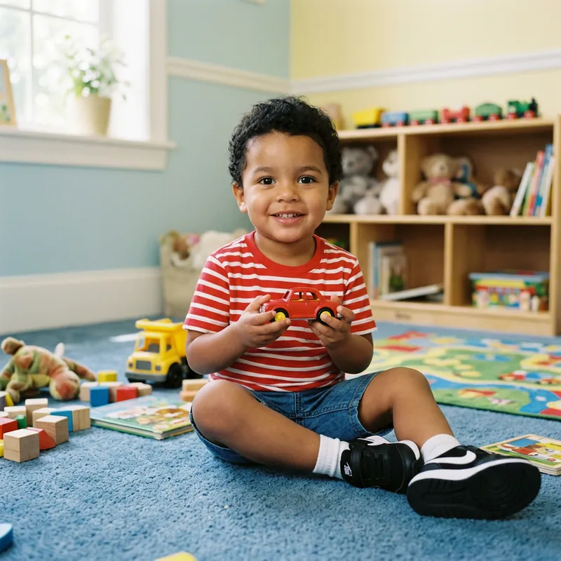 A small boy of Hispanic descent who has an innocent expression on his face. He has short, curly black hair, round brown eyes, and a playful smile. He is dressed in a red and white striped t-shirt paired with blue denim shorts. He wears white socks and black trainers. He is seen holding a toy car in his small hands. The environment around him is plain yet comforting with shades of pastel colours. Perhaps he's in his room, which has a blue carpet flooring and multicoloured toys scattered around.