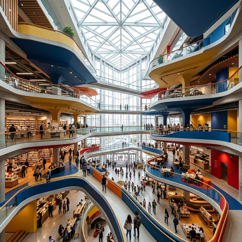 An innovative architectural design of a socio-commercial hub featuring rhizomatic patterns in its circulation. The building is comprised of distinct platforms, each representing a specific type of store. It employs a bold color palette recalling the dynamism and fluidity typical of early 20th-century modernist architecture, providing a futuristic ambiance with sleek lines and organic shapes. The composition's focal point is a grand atrium with cascading natural light, emphasizing the interconnectedness of the different platforms. Captured with a wide-angle lens to encapsulate the entire scope of this architectural design, this image showcases the vibrancy and energy of the space. This masterpiece blends contemporary and organic design elements, resulting in a visually stunning structure symbolizing the concept of a rhizomatic network.