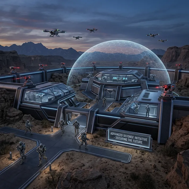 An image visualizing the concept of innovative defense systems. A futuristic military base located in a barren, rocky landscape. The base is equipped with high-tech weapons like energy shields and automated laser turrets. Furthermore, denote the presence of cutting-edge technology like AI-controlled drones and robotic soldiers for patrols. The overall atmosphere is tense, pointing to a heightened state of readiness, yet also hopeful, showing the positive implications of advancement in defense technology.