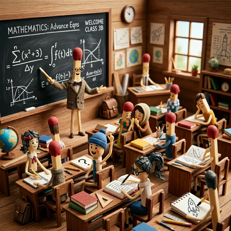 An imaginative, creative depiction of a classroom setting where all the students and the teacher are designed as matchsticks. Each matchstick character featuring a simplistic yet unique detail to represent different personalities. The teacher matchstick is at the front by the blackboard, expounding upon a complex equation, while the student matchsticks are variously engaged in listening intently, raising 'hands' with queries, taking down notes or whispering amongst themselves.