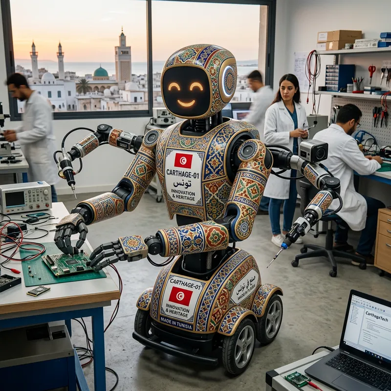 An innovative robot designed and built in Tunisia. The robot is of medium size, with the sleek and advanced appearance typical of modern robotics. Its outer shell is colored in traditional Tunisian patterns, exhibiting bright colors like blue, gold, and red. Attached to its body are multiple limbs with different functionalities. Its 'face' has friendly LED lights that can mimic emotional expressions. This Tunisian robot symbolizes the blend of rich cultural heritage and cutting-edge technology.