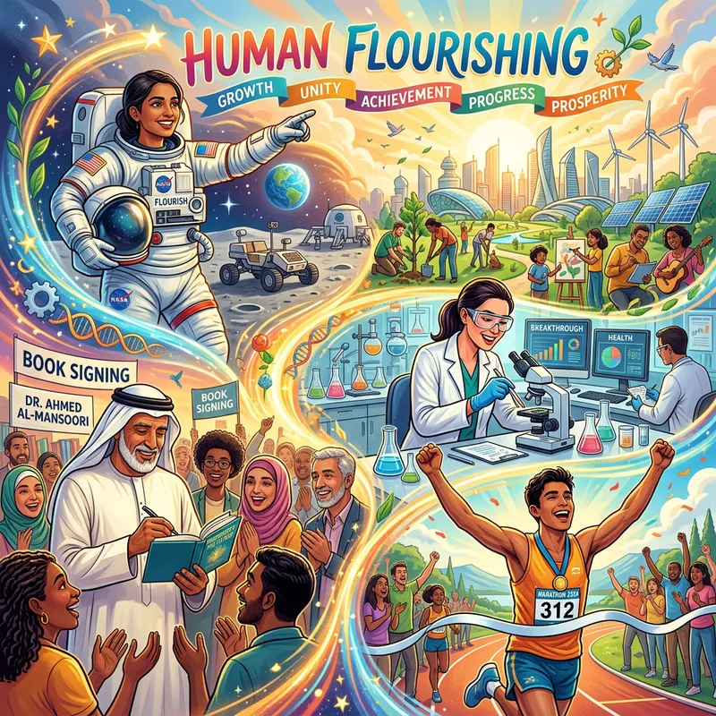 Show an image illustrating the concept of human flourishing. It should be depicted in a vibrant and energetic style that encapsulates the essence of both personal growth and societal success. Display various activities depicting human achievement and progress, each being performed by people of different descents and genders. For instance, a South Asian female astronaut exploring space, a Middle Eastern male author signing his successful book, a Caucasian female scientist working in her lab, and a Hispanic male athlete winning a race. The overall tone should be bursting with vitality and optimism, radiating the spirit of advancement and prosperity.