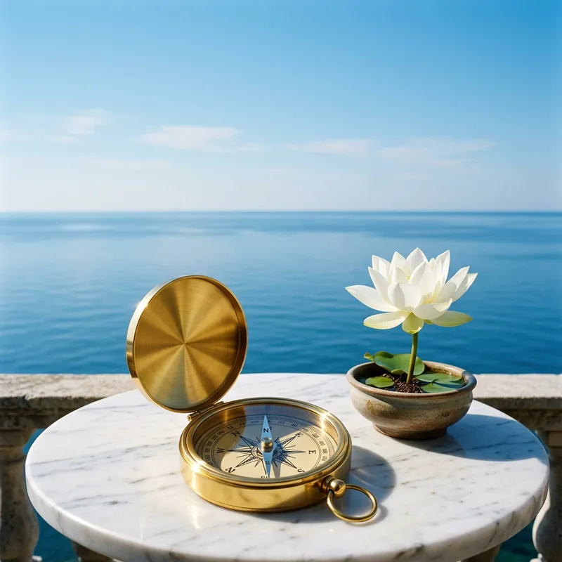 An abstract representation of the concept of integrity. A shiny golden compass, with its needle pointing north, on a white marble table. The compass could symbolize the moral compass, always leading towards ethical decisions. Behind the table, there is a vast, calm sea under the clear blue sky. This could stand for peace and tranquility that comes with living a life of integrity. A single, blooming white lotus in a small pot placed next to the compass may symbolize purity and nobility, further emphasizing the theme of integrity.
