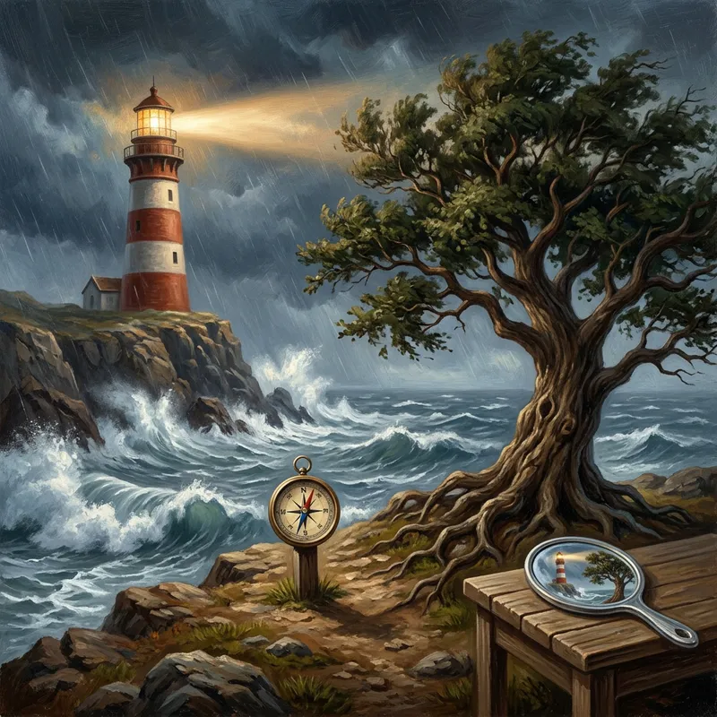 The Power of Integrity: Lighthouse, Oak Tree, Compass, Clear Mirror