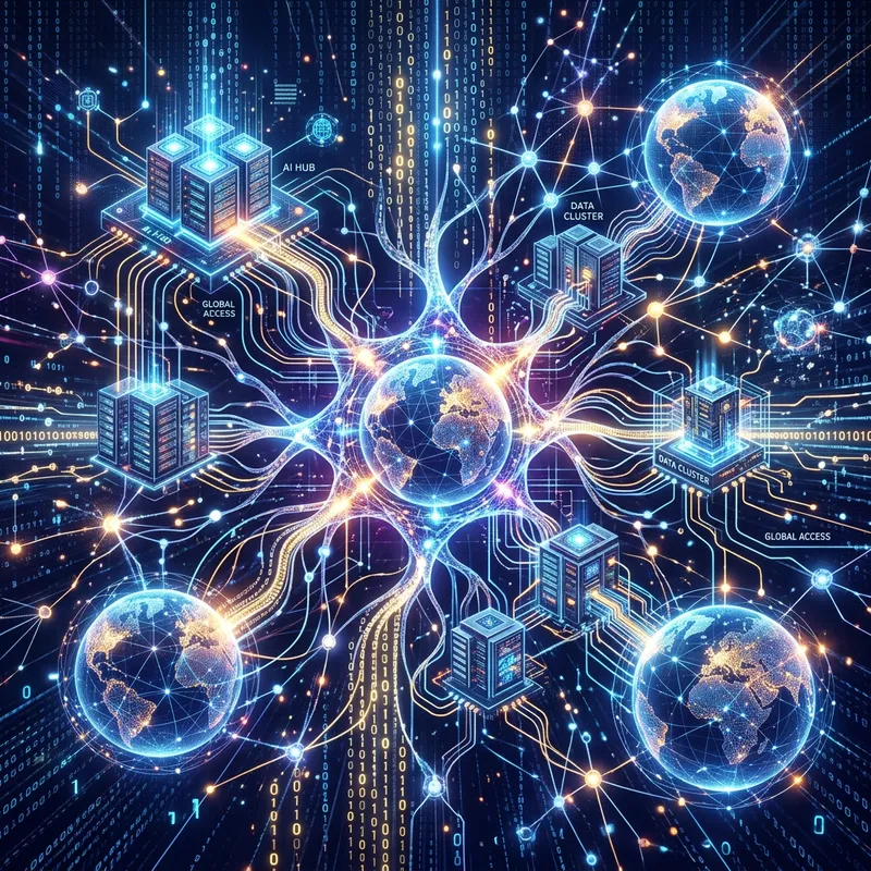 An abstract representation of artificial intelligence as a complex web of interconnected servers, binary codes, neural networks, and digital globes