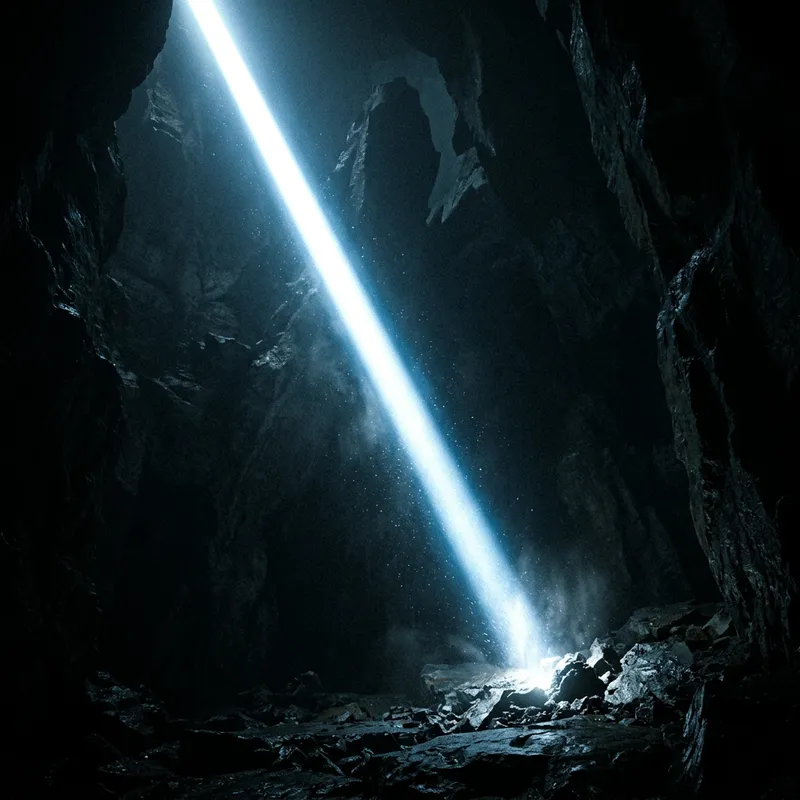 An intense, solitary beam of light piercing through the absolute darkness of a mysterious realm.