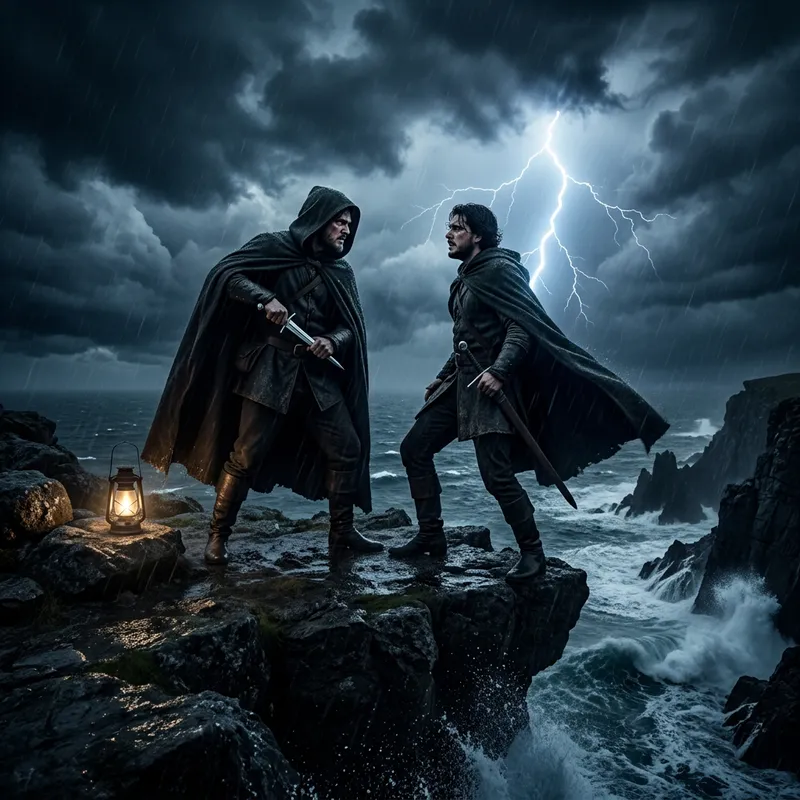 Visualize a scene that represents the theme of betrayal, dramatic and intense. Perhaps a moment where a trusted friend is revealing a hidden dagger, under the cover of a stormy night. The atmospheric lighting illuminates their malicious intent as they stand near the edge of a cliff while the waves crash below. Enhance the emotion with strong visual elements: the dark storm clouds gathering overhead, contrasted with jagged flashes of lightning, and the figures standing in harsh silhouette against the tumultuous sea.