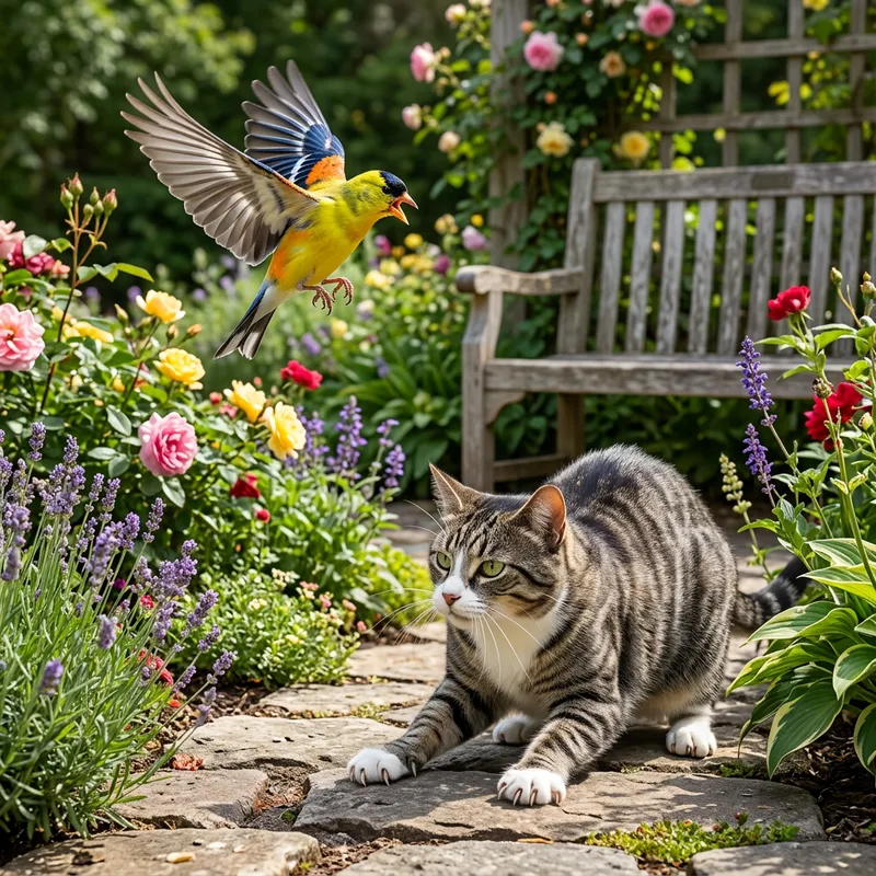 An intense scene unfolding outdoors on a sunny day. A small, brightly-colorful bird is in mid-air with wings spread wide, exhibiting its vibrant plumage. The bird's beak is opened, seemingly squawking defiantly at its adversary. A large cat, almost twice the size of the bird, with striped grey and white fur, is also in a pounce position, ready to leap. The cat's green eyes are focused on the bird, its claws extended for an attack. Both creatures are within a garden filled with various flowering plants, a stone pathway, and a wooden bench in the background.