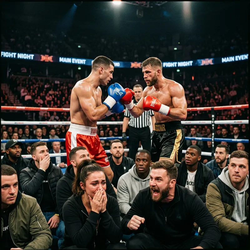 Depict a staged boxing match between two athletic men who have trained bodies. Both fighters stand tall at 186cm. One has a short dark blonde hair and a 3-day beard being clearly visible on his face. Around them, an audience watches with bated breath, their faces showing a mix of emotions from exhilaration to concern. Some spectators even appear teary-eyed, completely engrossed in this dramatic spectacle. Everyone is appropriately dressed for this event, with the fighters wearing classic boxing gear and the audience sporting casual outfits.