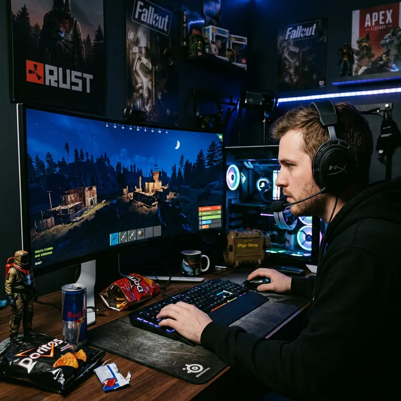Create an image of a Caucasian male engrossed in a game of survival on his high-end gaming setup. The surroundings are dimly lit, reflecting the ambience of the game 'Rust'. The screen spills out the glow of a vast apocalyptic landscape with dilapidated buildings and wilderness. His intense focus is visible, with a headsets on, hands tightly gripping the mouse and keyboard. Gaming memorabilia and snack remnants are scattered around showing signs of a marathon gaming session.