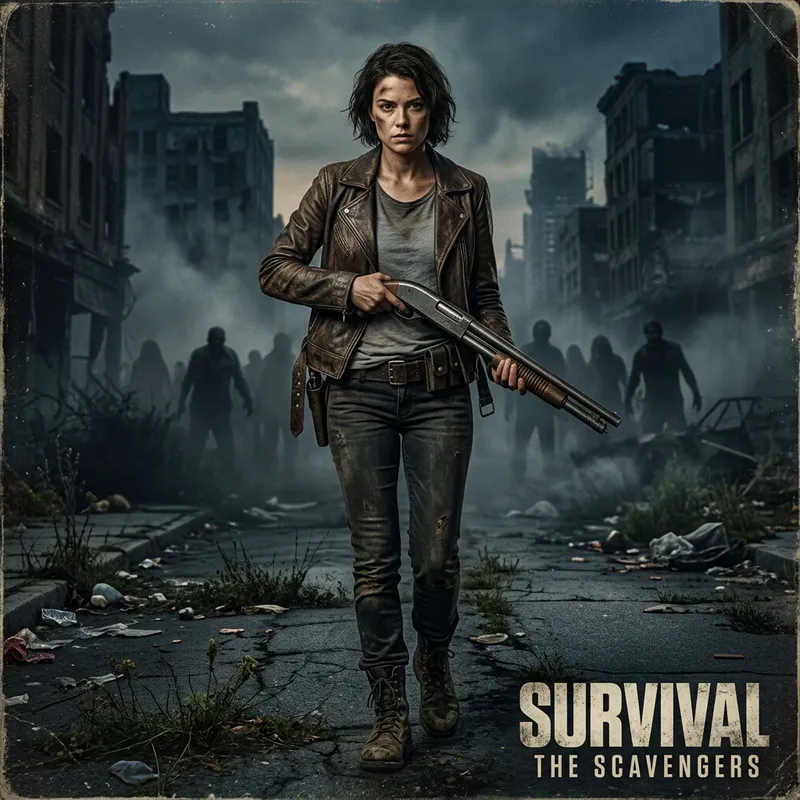 An image of a female character who could be the sister of a rugged, former sheriff's deputy in a popular zombie apocalypse TV series. She's portrayed in a poster-like style, with intense, determined look on her face. The backdrop evokes a dystopian, post-apocalyptic world, with destroyed buildings and hordes of zombies shaded in the background. Her attire suggests practicality for survival - worn out boots, jeans, and a leather jacket. She holds a firearm firmly, ready to face anything that comes her way. Patches of grimy, unkempt streets can be seen through ominous fog around her.