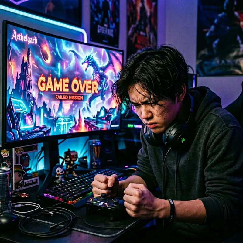 A scene depicting the frustration and intensity of a gaming session. The main focus is on a despairing East Asian male teenager, who while keeping his hands on the controls, has an expression of despair after losing in a challenging video game. His clenched fists and furrowed brows underlines the intensity. In the background, the surreal, neon-lit video game world, full of futuristic landscapes and mythical creatures, is displayed on the gaming screen.